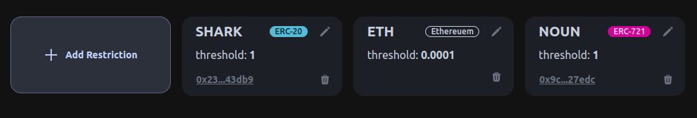 Define assets users must hold to submit. Users satisfying at least **ONE** restriction will be eligible.